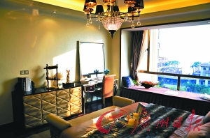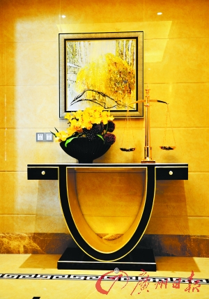 屋里的家具融合了各种丰富的元素,亮光木饰面的封闭漆效果,不仅能将木皮的纹理尽情展示,在徒手触摸能感受到油漆饰面后的光滑平整;局部采用金属、描金、拉扣等工艺突显品质感。家具的选型从简单到繁杂、从整体到局部,用现代的手法和材质还原古典气质,功能性强且造型优美。布料的沙发让天蝎感觉不到力量,June选择天蝎主宰的深色,沙发的接触面采用具有天然毛孔和皮纹的真皮,手感丰满、柔软,富有弹性。客厅背景墙一幅巨型油画,涌动着地神奇变化的风云,咆哮微茫的海涛,以西方现代绘画的形式和油画的色彩技巧,且渗透着中国传统文化艺术的意蕴,触人心弦,令人融化在无尽的艺术幻想当中。