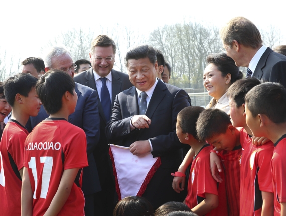 今年3月,习主席访问欧洲,数次以足球话友谊:在荷兰国王举行的国宴上,习主席与荷兰传奇球星范德萨亲切交谈,赞扬他是中国球迷的偶像;在中荷经贸合作论坛上,习主席称荷兰足球队为世界足球的“无冕之王”,博得满堂彩;在巴黎举行的中法建交50周年纪念大会上,习主席提到刚刚担任中国男足主教练的法国人阿兰·佩兰,并祝他好运。访德期间,习近平和夫人彭丽媛专程看望了在德参加训练的陕西志丹少年足球队队员,并观看他们比赛。