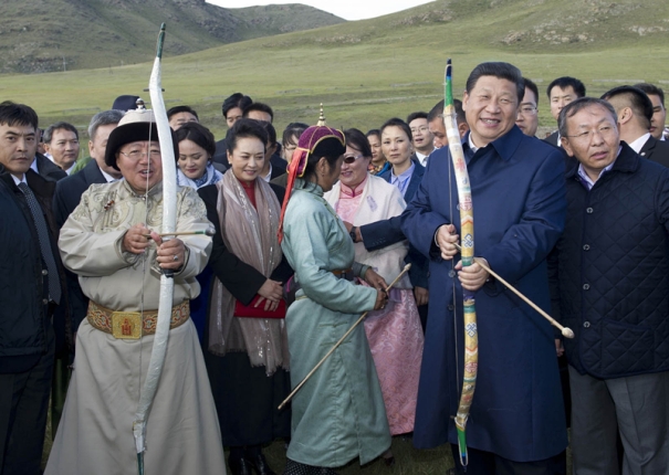 (8月22日,国家主席习近平在蒙古国总统额勒贝格道尔吉陪同下前往乌兰巴托市郊观看那达慕。这是习近平与额勒贝格道尔吉一起弯弓搭箭。摄影黄敬文)