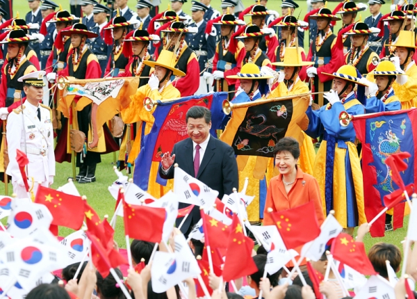 (7月3日,国家主席习近平在首尔同韩国总统朴槿惠举行会谈。会谈前,朴槿惠在青瓦台总统府为习近平举行隆重欢迎仪式。 摄影姚大伟)