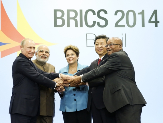 (7月15日,国家主席习近平在巴西福塔莱萨出席金砖国家领导人第六次会晤并发表重要讲话。这是习近平同出席会晤的巴西总统罗塞夫、俄罗斯总统普京、印度总理莫迪、南非总统祖马合影。摄影兰红光)