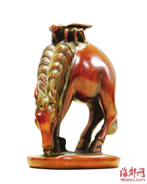 昨日,记者看到了这个枣红色的摆件雕着一匹马,作低头饮水状,马背上则立着一只昆虫。有的人觉得这是一只蝉,有的则说更像只苍蝇。“马上有蝉”,“马上有蝇”,大家猜测一番后,觉得这昆虫是苍蝇的可能性很大。