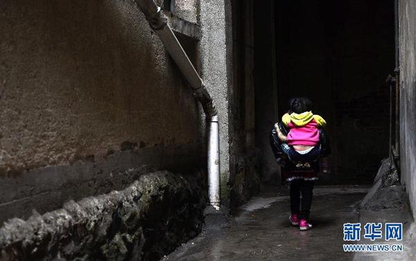 11月29日,徐娜背着妹妹徐婷下楼买东西。 8岁的徐娜是江西省修水县的一名小学生。徐娜的母亲在3年前患上尿毒症,求医花光了家中所有积蓄。原本小康的四口之家如今只能蜗居在县城一处月租200元的旧楼里,靠父亲打工和社会爱心人士救助维持生活。为帮父亲减轻负担,身高1米2、体重不到40斤的小徐娜几乎“承包”了所有家务。新华社记者陈子夏摄