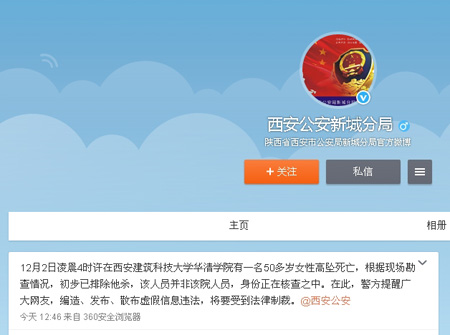 人民网北京12月2日电 今日上午,有消息称“西安建筑科技大学华清学院有学生自杀死亡”。随后,西安市公安局新城分局通报澄清:死者为一名50多岁女性,高坠死亡。