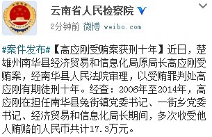 据云南省人民检察院官方微博消息,近日,楚雄州南华县经济贸易和信息化局原局长高应刚受贿案,经南华县人民法院审理,以受贿罪判处高应刚有期徒刑十年。