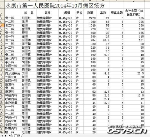 统方是医院对医生用药信息量的统计。帖子中所附四张统方涉及三家医院,分别为永康市第一人民医院、浦江人民医院、金华人民医院。统方详细列出了相关医生姓名、科室、药品数量、每盒金额以及合计金额等统计条目。其中“合计金额”一项备注为“给医生的钱”。
