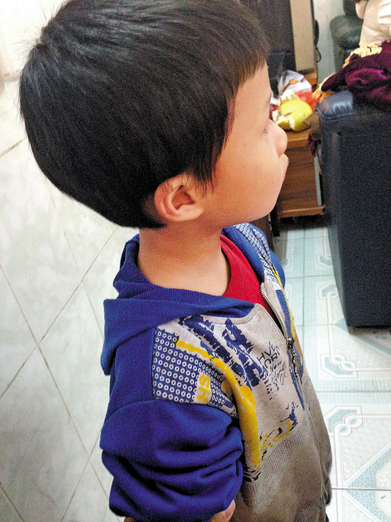 “太顽皮了,一有时间就跑出去玩,一天到晚找不到人。曾经跑出去玩耍,连脑袋都摔破了。上周六早上一大早就不见人了,我们一家人找了一天都没找到,直到晚上11点他才自己回到家。为防止他到处乱跑,所以我用铁链套住他的双手,但并没有固定在某个位置,他可以在家中四处走动。因为戴着铁链,他就不好意思去外面东跑西跑了。”