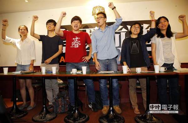 台“反服贸”学运代表、台湾大学政治所学生林飞帆、台湾清华大学人社系学生陈为廷等人18日召开“岛国前进”组织成立记者会,他们表示半年内将推动废除“公投法”50%成案门坎的“公投提案”,但新组织目前为止没有要成立政团或推候选人的打算。 图片来源:台湾《中时电子报》
