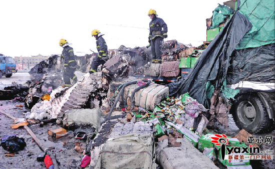 10日清晨,经过两天两夜长途行驶的李运喜终于把大货车从巴楚县开到了距目的地不远的乌鲁木齐市雅山中路252号昊天312停车场门口,可当他在驾驶室里休息并等待进场时,大货车上的货物却着火了,虽然停车场的门卫及时叫醒正在睡觉的李运喜,但因火是在货物里面燃烧的,灭火器无法控制火势蔓延,车上约25吨货物全被烧毁。(亚心网记者 张万德 王前喜 摄影报道)