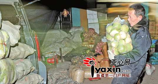 在一些人手少的批发摊位前,为了赶时间,及时把蔬菜装车,赵刚只好自己当“搬运工”。图 亚心网记者 马元 摄