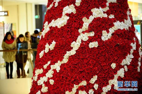 新华社照片,沈阳,2014年12月11日 “玫瑰花圣诞树”亮相沈阳 这是12月11日在沈阳一商场拍摄的“玫瑰花圣诞树”。当日,沈阳一商场用玫瑰花搭建的一棵大型圣诞树与公众见面。这棵圣诞树高13米,直径8米,由10万朵仿真玫瑰花构建而成。 新华社发(张文魁摄)
