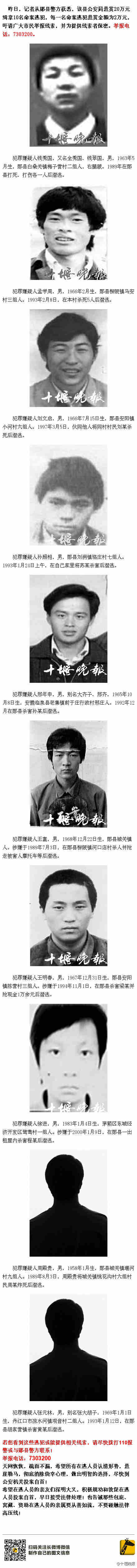 湖北十堰市郧县悬赏20万缉拿10名逃犯