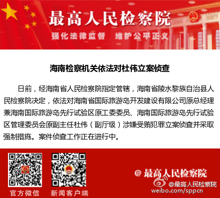 人民网北京12月15日电 (李楠楠)记者从最高人民检察院获悉,日前,经海南省人民检察院指定管辖,海南省陵水黎族自治县人民检察院决定,依法对海南省国际旅游岛开发建设有限公司原总经理兼海南国际旅游岛先行试验区原工委委员、海南国际旅游岛先行试验区管理委员会原副主任杜伟(副厅级)涉嫌受贿犯罪立案侦查并采取强制措施。案件侦查工作正在进行中。