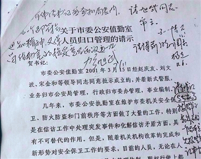 佳木斯政府大楼里设假警察、假派出所,图为2003年的请示文件及时任市领导的批示(12月16日摄)。新华社发