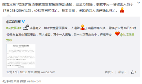 人民网北京12月18日电 据江西省人民政府新闻办官方微博消息,南义第1号煤矿冒顶事故应急救援指挥部通报,经全力救援,事故中另一名被困人员于17日23时25分找到,经检查已经死亡。截至目前,被困的两人均已确认死亡。