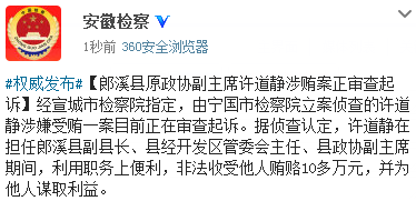 安徽郎溪县原政协副主席许道静涉贿案正审查起诉