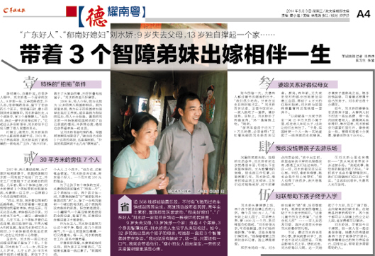 今年9月被评为“广东好人”之后,刘水娇获得了1万元的资助款。“回到家后,我把奖状收起来了。”刘水娇腼腆地笑了笑,“照顾弟妹是我一辈子的责任。”