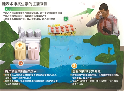 北京师范大学水科学研究院副院长王金生介绍,全国的主要河流——海河、长江入海口、黄浦江、珠江、辽河等河流的部分点位中都检出了抗生素,其中,珠江广州段受到抗生素药物的污染非常严重,脱水红霉素、磺胺嘧啶、磺胺二甲基嘧啶等典型抗生素的含量分别为460、209和184纳克每升,远远高出了欧美发达国家河流中100纳克每升以下的含量。由于很多江河是城市的饮用水源地,居民家中的饮用水里也有抗生素被检出。