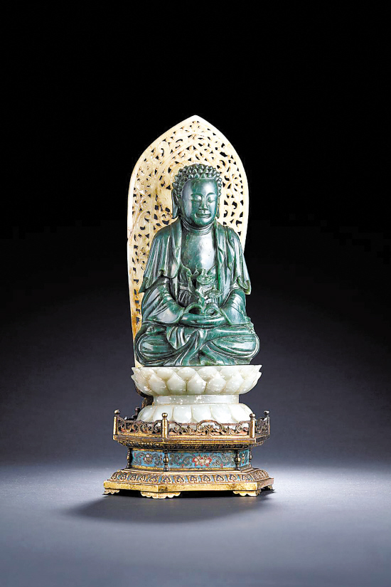 碧玉佛坐像原配白玉背光莲花座及掐丝珐琅底座(清乾隆)