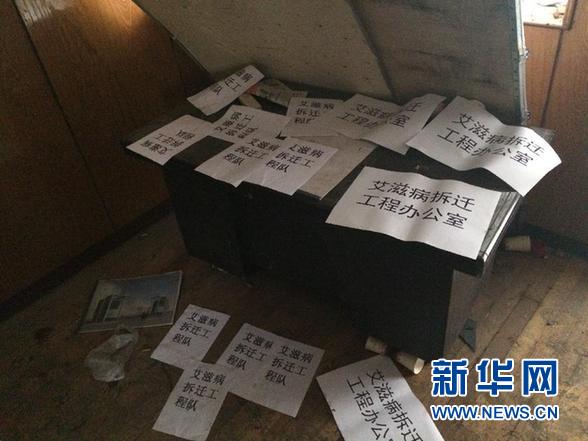 该小区一栋楼的三楼,一处早已搬空的房间里散落着许多“艾滋病拆迁工程办公室”打印纸(12月26日摄)。 新华社记者张兴军摄