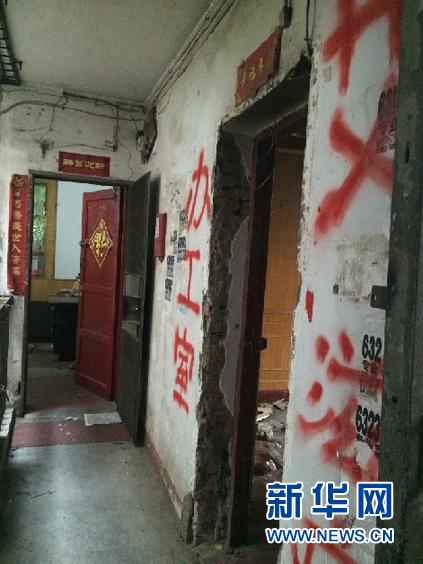 记者在现场看到,从小区院外到楼道里,从一楼到顶楼,随处可见“艾滋病拆迁队”等字样的标语,红色喷漆格外触目惊心。三楼一处早已搬空的房间大门上,还写着“艾滋病拆迁办工室”。