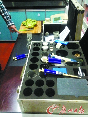 金礼村农贸市场的食品安全检验室设置在市场的二楼。记者进入采访时,一名检测人员正在对生菜进行农药残留检验。只见检测人员将检验试剂进行检测后,立即可以检测出蔬菜有否农药残留超标。“昨日检测以来,所有蔬菜都是合格的。”检测人员说。图为该检验室的检测仪器和工具。