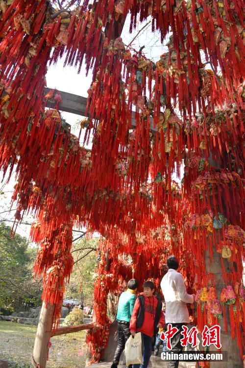 12月28日,成都锦里一棵银杏树下,各地游客将买来的香囊写下愿望便挂在树上。这棵银杏树在唐代便种下,已经生长了一千多年,长期以来,这棵古老的银杏树被当成许愿树,主干被数万个香囊“缠身”颇为壮观。张浪摄![]()