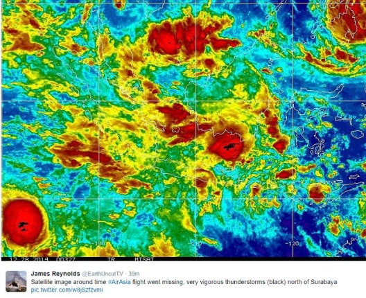 根据英国广播公司发布的一张客机失联时的天气云图显示,印尼空域当时云层较厚。BBC天气播报员达伦·贝特说,每年这个时候,亚航客机失联区域出现雷暴的情况并不少见。雷暴也叫做积雨云,大量的不稳定能量、充足的水汽和足够的冲击力是形成雷暴的三个必要条件。雷暴虽然延续时间短,但几乎总是伴随雷电、阵雨、阵风及冰雹等天气现象,有时也伴有龙卷风,是一种能够使飞机坠毁的气流。