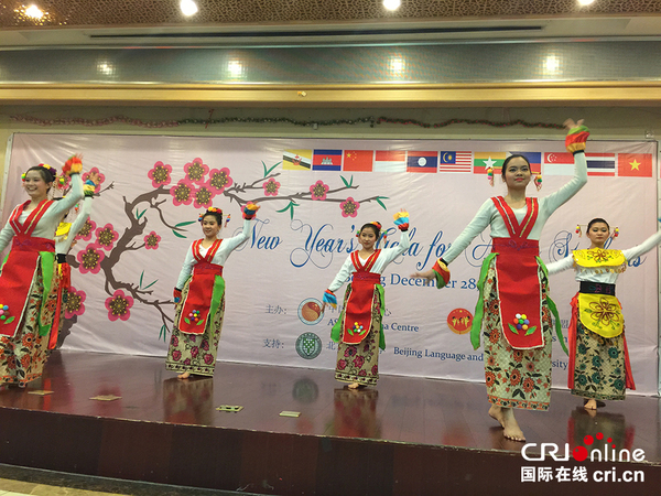 国际在线消息(记者 陈敏玲、阮秋玄):2015东盟学生新年联欢会28日在北京语言大学举行,东盟国家在京留学生现场呈现了包括风情万种的印尼舞蹈、节奏欢快的越南民间舞、自由轻松的柬埔寨民间舞蹈、韵律感十足的泰国舞蹈等具有本国的特色的表演。