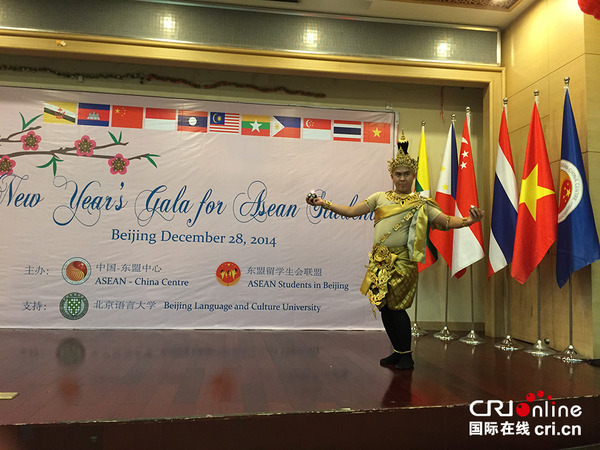 国际在线消息(记者 陈敏玲、阮秋玄):2015东盟学生新年联欢会28日在北京语言大学举行,东盟国家在京留学生现场呈现了包括风情万种的印尼舞蹈、节奏欢快的越南民间舞、自由轻松的柬埔寨民间舞蹈、韵律感十足的泰国舞蹈等具有本国的特色的表演。