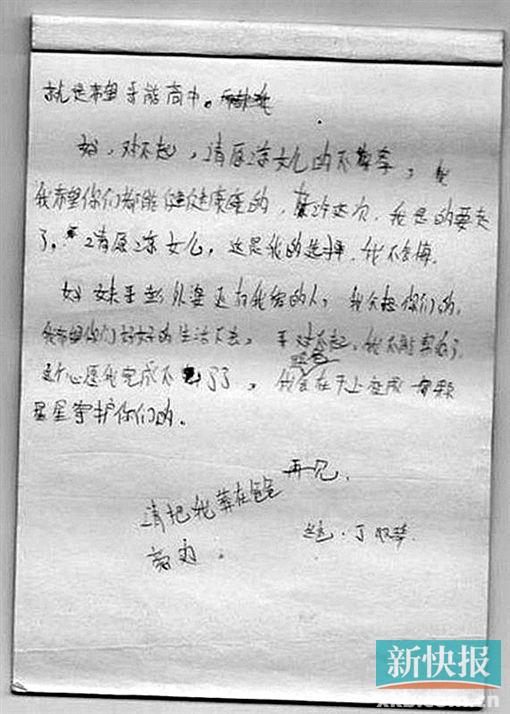 妈、妹、哥、外婆,还有我爱的人,我会想你们的,我希望你们好好地生活下去,哥,对不起,我不能帮你了,这个心愿我完成不了了。我跟爸会在天上变成一颗星星守护你们的。