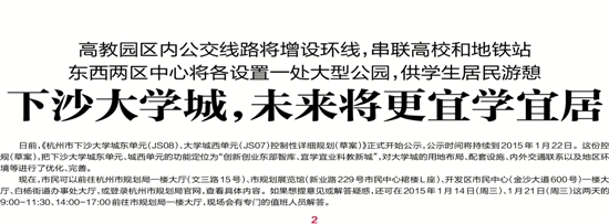 日前,《杭州市下沙大学城东单元(JS08)、大学城西单元(JS07)控制性详细规划(草案)》正式开始公示,公示时间将持续到2015年1月22日。这份控规(草案),把下沙大学城东单元、城西单元的功能定位为“创新创业东部智库、宜学宜业科教新城”,对大学城的用地布局、配套设施、内外交通联系以及地区环境等进行了优化、完善。
