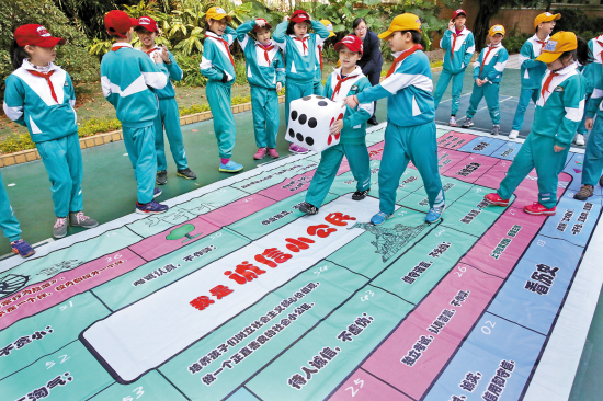 东风东路小学学生们自己设计了“争当诚信小公民”康乐棋,在游戏中培养“诚信小公民”