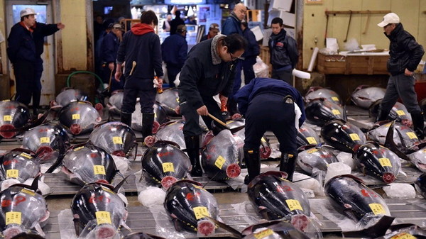 国际在线专稿:据日本《产经新闻》1月5日报道,位于东京筑地的中央批发市场5日举行了今年的首场金枪鱼拍卖会,一条重达180.4公斤的蓝鳍金枪鱼拍出了451万日元(约合人民币23.27万元,一公斤相当于1290元)的高价。