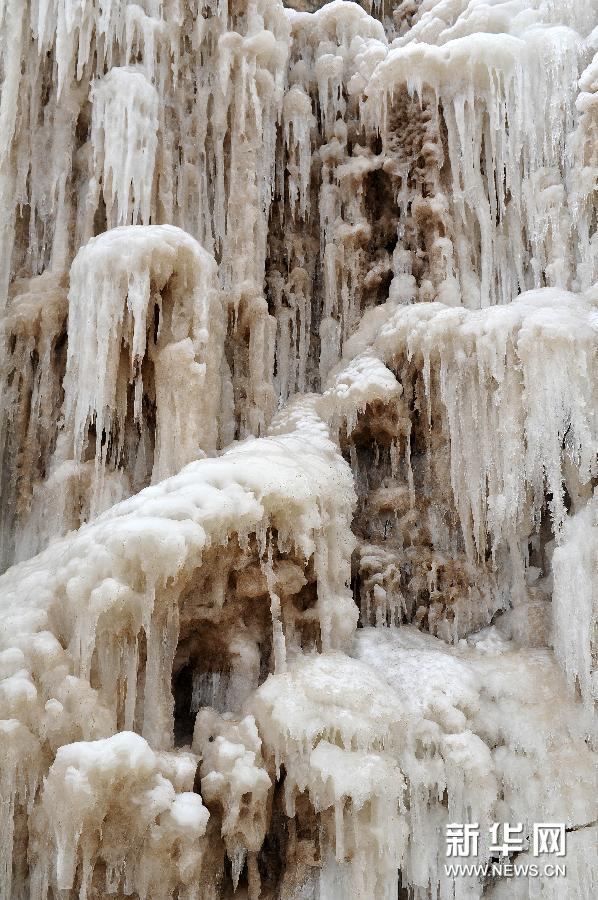 1月5日,游客在彭阳县境内的茹河瀑布观赏冰瀑景观。由于连日来的低温天气,位于宁夏回族自治区彭阳县境内的茹河瀑布形成了罕见的冰瀑景观,吸引周边地区的不少游客前往一饱眼福。 新华社记者彭昭之 摄