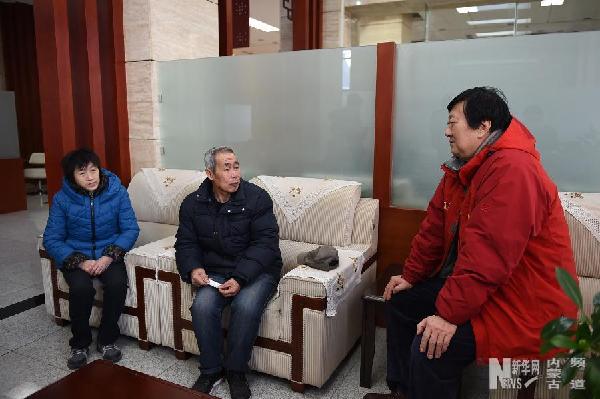 1月5日,新华社记者汤计(右)与蒙冤而死的呼格吉勒图父母李三仁、尚爱云在呼和浩特市中级人民法院休息室等待。新华社记者邵琨摄