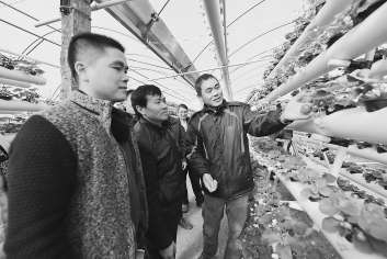 连日来,建阳市潭城街道考亭春丰家庭农场草莓果园吸引了不少游客和前来取经的人。果园运用水肥一体化模式立体种植草莓。这项新技术的应用提高了3倍多的土地利用率。春丰家庭农场主朱坤华把草莓种在葡萄园内,形成草莓、葡萄连片,这样不但利于管理,也让农业观光旅游在季节上相互连接。图为朱坤华(右一)在草莓果园介绍草莓栽培新技术。 张正松 摄
