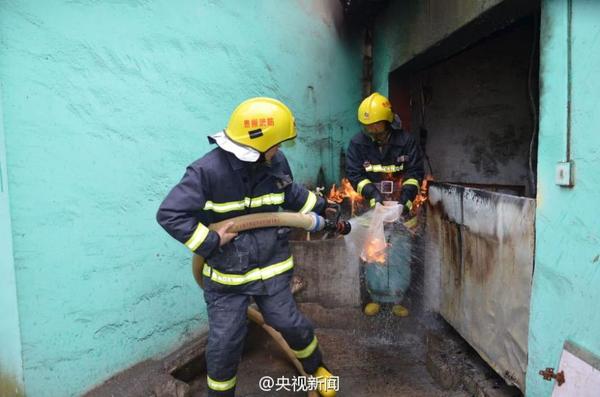 据央视新闻官方微博1月6日报道,1月6日10时30分许,贵州紫云县松山镇一羊肉火锅店发生火灾。起火的厨房内有4瓶液化气罐,其中一瓶正猛烈燃烧,随时可能发生更大的意外。紫云消防的两名消防警官冒死将着火的液化气罐转移至安全地带,化险为夷。图片来源:央视新闻官方微博
