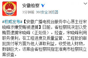 安徽广播电视台服务中心原主任宋晓峰涉嫌受贿被逮捕