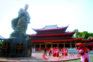 印尼三宝垄三保洞,一群印尼学生在参观郑和塑像。