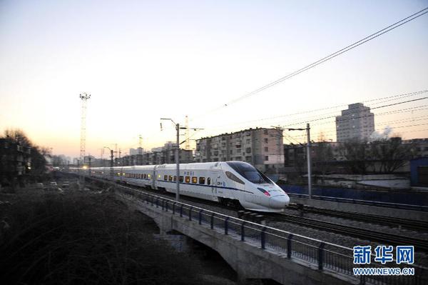 新华社照片,呼和浩特,2015年1月8日 内蒙古首次开通动车 1月8日清晨,一列动车组列车从呼和浩特城区驶过。当日6时20分,D6751次列车由呼和浩特东站始发,开往包头,这是内蒙古首次开通动车组列车。据呼和浩特铁路局介绍,呼和浩特东至包头开行13对26趟,包头至集宁南开行2对4趟,运行时间从6点20分至22点。新华社发(王伟 摄)