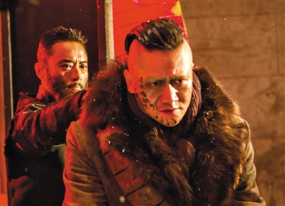 杨一威:很好啊,应该拍个杨子荣和老八的前传。我自己分析了下,老八喜欢杨子荣是因为他敢杀老虎独自闯威虎山,敢单独面见三爷,有里有面儿,各方礼节都懂,又人高帅气,就开始慢慢崇拜他,像女孩暗恋上一个男孩那样,虽然不表白,但一举一动都那么让我痴迷。他一个挑眉一个小笑容,我都会去模仿,他穿皮大氅我也想弄一身儿,我甚至觉得他梳那个大背头都帅。之前老八的头发是朋克风(图①),但杨子荣(图②左)来了以后一切都变了,老八从此放弃了自己追求朋克的梦想,开始追求杨子荣的风格。百鸡宴烧香拜山门时,我不知道你有没有注意到,老八也弄了个背头(图②右),老九站在这我就挨着他,老九走过去我也贴着他,反正要跟老九走得近,我也要变成老九那样。