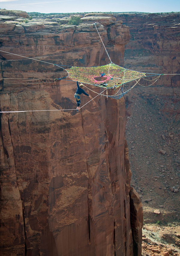 国际在线专稿:据英国《每日邮报》1月8日报道,来自美国的28岁极限冒险爱好者安迪·刘易斯(Andy Lewis )近期在犹他州荒漠的百米高空,如蜘蛛般织就了一张绳索大网,他和其他挑战者们在上面表演了弹跳、跳伞、走钢丝等绝技,惊险程度让人目瞪口呆。