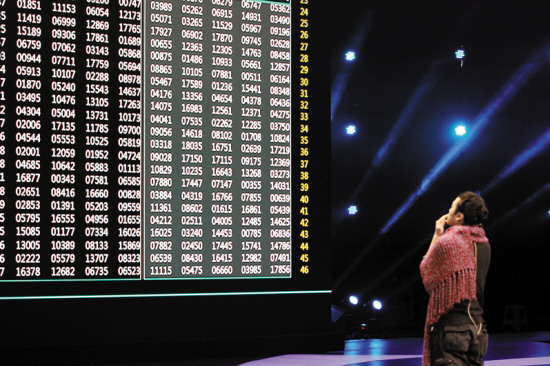 1380个五位数让现场大屏幕变成了一个密密麻麻的数字矩阵,数字在屏幕上跳动。舒淇不禁感慨:“像好多只蚂蚁在上面爬!”现场观众也是眼花缭乱,频频揉眼。“数字怪杰”林建东的任务,就是在巨大的数字矩阵中,飞速运算找出其中的7个质数,对心算能力是个极大的挑战!私下,林建东几乎做完了所有智商测试题,基本清一色是满分,可能这些针对平常人所设定的智力标准,根本无法测试出他真正的脑力。