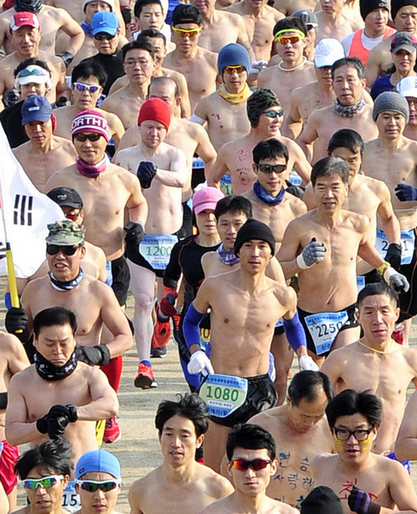 韩国大邱举办“裸体马拉松” 700人寒冬光膀跑步(组图)