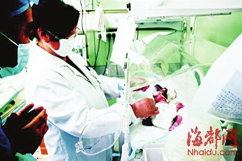 医护人员在看保温箱里的孩子