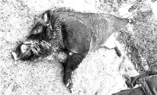 虽然子弹全部击中了野猪,它受伤流血了,但看上去仍十分凶猛。还是嗷嗷直叫,一个劲地要蹿上来。