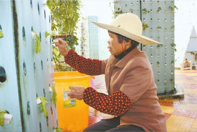 龙岩永定下洋镇觉川村坤雅农业观光园的鸟巢式温室大棚里,一根根竖立的柱子上长满了青菜。农场负责人林国强介绍,这是立体无土栽培,竖立的柱子里有6个喷头,不断给蔬菜输送营养液。温室大棚里一年可以轮种六次,这种种植模式可以提高土地利用率10倍以上。图为农户在栽培板上移植青菜。 王占鑫 摄影报道