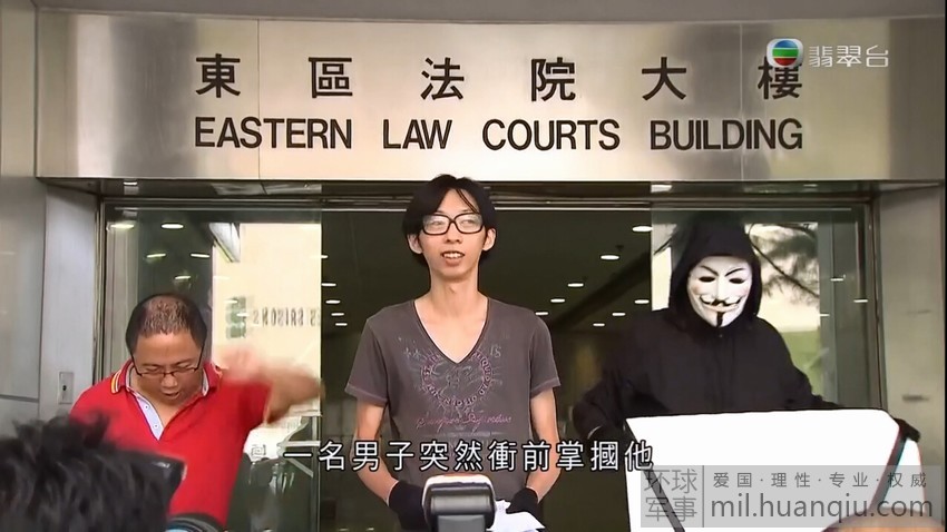 在进入法院前,招显聪与他的一名支持者喊港独口号。