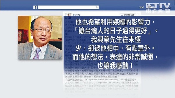 胡志强14日在脸书宣布投入旺旺中时媒体集团工作。